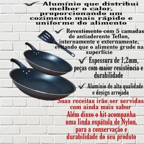 Conjunto de Frigideiras Francesas 26 e 22 com Espátula - item indispensável na sua cozinha, produzido com alumínio de alta qualidade, espessura de 1,1 mm, peças com maior resistência e durabilidade, alumínio que distribui melhor o calor, proporcionando um cozimento mais rápido e uniforme do alimento, Frigideiras revestidas com 5 camadas de antiaderente TEFLON (DuPont) - PFOA Free, internamente e externamente, evitando que o alimento grude na superfície, o que facilita no preparo dos alimentos e proporciona praticidade no momento da limpeza. Possui cabo com espaçador metálico, feito em baquelite, um material antitérmico, que não retém calor, contribuindo para um manuseio mais confortável e seguro. Além disso o conjunto acompanha uma linda espátula de Nylon, ideal para a conservação e durabilidade do seu produto!