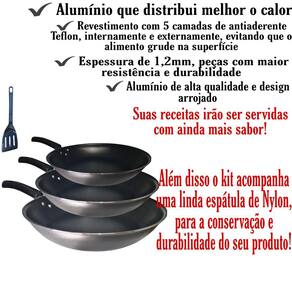 Prazer, somos a Coisas & Trecos.Nossa missão é garantir a satisfação total dos nossos clientes, entregando produtos de qualidade e excelência no atendimento.Assim estabelecendo uma relação de confiança, oferecendo a você, a melhor experiência de compra!Quer um toque especial para sua casa? Então você não pode deixar de conhecer, nossa variedade de produtos, criativos, de alta qualidade e originalidade.Para garantir sua melhor experiência, recomendamos que leia completamente a oferta e as descrições do produto pretendido, e caso tenha alguma dúvida utilize o campo de perguntas para que nossa equipe possa lhe auxiliar.Tenha a tranquilidade de comprar com quem está disposto a te oferecer, o melhor suporte e atendimento, sua confiança e satisfação valem ouro para nós. Nossa equipe de pós venda está à disposição para te auxiliar e esclarecer eventuais dúvidas.Aguardamos seu pedido!Especificações do Produto Cozinhar é a arte de misturar sabores e encantar, é na cozinha que a mágica acontece, que os amigos se reúnem, que as alegrias se multiplicam...Beleza, charme, praticidade na hora de cozinhar, você vai se encantar por esse Conjunto de Frigideira Francesa 22, 24 e 26 com espátula de nylon, sua cozinha merece esse mimo! Conjunto de Frigideiras Francesas 22, 24 e 26 Color com Espátula - Coisas & Trecos, item indispensável na sua cozinha, produzido com alumínio de alta qualidade, espessura de 1,1 mm, peças com maior resistência e durabilidade, alumínio que distribui melhor o calor, proporcionando um cozimento mais rápido e uniforme do alimento, Frigideiras revestidas com 5 camadas de antiaderente TEFLON (DuPont) - PFOA Free, internamente e externamente, evitando que o alimento grude na superfície, o que facilita no preparo dos alimentos e proporciona praticidade no momento da limpeza. Possui cabo com espaçador metálico, feito em baquelite, um material antitérmico, que não retém calor, contribuindo para um manuseio mais confortável e seguro. Além disso o conjunto acompanha uma linda espátula de Nylon, ideal para a conservação e durabilidade do seu produto! Especificações Técnicas: Dimensões aproximadas - cm: (Altura x Largura x Comprimento - Capacidade volume):- 1 Frigideira Francesa 22 cm de diâmetro - 5 x 22 x 37 – 1,1L- 1 Frigideira Francesa 24 cm de diâmetro - 5 x 24 x 39,5 – 1,3L- 1 Frigideira Francesa 26 cm de diâmetro - 5 x 26 x 41,5- Espátula Nylon Material: Alumínio RevestidoMaterial Espátula: NylonRevestimento Interno: Antiaderente Teflon Externo: Antiaderente Teflon – Cor ( a escolha da variação) Espessura Material: 1,1mmTampa: NãoAlça: BaquelitePeso Conjunto: 316 gPeso Embalagem: 145 gEmbalagem: Saco Plástico / Caixa PardaDimensões aproximadas da embalagem (AxLxP): 34 x 28 x 9 cmGarantia do fornecedor: 30 dias contra defeitos de fabricação. Cuidados:- Antes de usar pela primeira vez, lave com esponja macia, detergente neutro, depois de secar, unte a área interna com óleo e aqueça em fogo baixo por 1 minuto. Deixe esfriar é só lavar e seu produto está pronto para uso, sempre em fogo baixo ou médio (nunca superior a 350°C);- Ideal para fogão a gás, elétrico e vitrocerâmico com resistência elétrica;- Para mexer os alimentos use somente utensílios de silicone ou nylon;- Nunca use utensílios de metal ou objetos pontiagudos;- Mantenha o produto sobre a chama do fogão apenas o necessário para o cozimento;- Não exponha as alças e cabos diretamente ao fogo ou fonte de calor prolongado;- Não pode ser levada ao forno e/ou microondas;- Evite a imersão do produto quente em água fria. Sempre o deixe esfriar antes de lavar;- Para limpeza, utilize sabão ou detergente neutro e esponja macia;- Nunca utilize solventes, objetos cortantes ou abrasivos;- Para maior durabilidade do produto recomenda-se secar bem antes de guardar. Informações do Fabricante: Coisas & Trecos possui 18 anos de experiência no mercado de alumínio e utensílios para casa. A Coisas & Trecos tem como norte o desenvolvimento com estreitas e duradouras parcerias com fabricantes e fornecedores, com o objetivo de entregar aos seus clientes produtos de qualidade. Detalhes:- Com Antiaderente Teflon PFOA Free, que garante a ausência de elementos nocivos à saúde em sua composição- Ao comprar seu Conjunto de Frigideira Francesa 22, 24 e 26 Color com Espátula de Nylon, você receberá em seu endereço: 1 Frigideira Francesa 22 cm; 1 Frigideira Francesa 24 cm e 1 Frigideira Francesa 26 cm, na cor escolhida no ato da compra e uma linda: Espátula de Nylon. - Itens decorativos não acompanham o produto. Imagens meramente ilustrativas (a cor do produto pode sofrer alteração de acordo com a qualidade do monitor).- Para descarte dos produtos e embalagens siga as orientações de reciclagem vigente. Estamos à disposição para qualquer dúvida. Agradecemos a sua visita e aguardamos seu pedido!