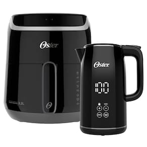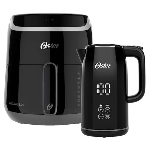 Kit Oster contendo Fritadeira Digital Fryer 3,2L e Chaleira Digital Black 1,7L com controle de temperatura. Fritadeira com painel touch, cesto antiaderente e timer de 60 minutos. Chaleira com funções pré-programadas, anti-dry function e manter aquecido.Tipo