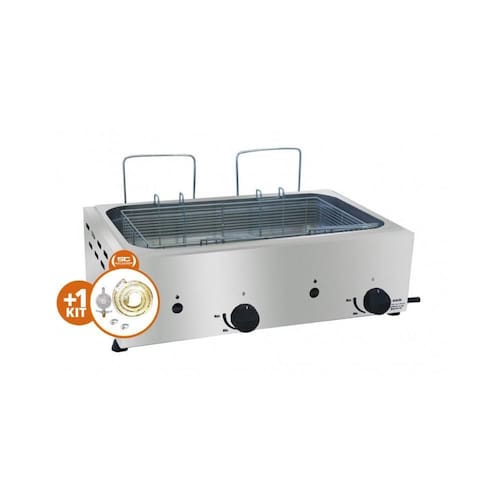 Modelo sfg111 Material aço inox 430. Prepara salgados e frituras em geral. Trabalha á gás glp baixa pressão. Cuba para óleo estampada em aço inox no modelo gastronorm de 1/1 Medida de cada cuba: 53 cm x 32,5 cm x 10 cm Manipulador com regulagem de 3 posições desligado, mínima e máxima Orifício central nos modelos á gás para facilitar o acendimento Capacidade mínima óleo - 6,0lts. Capacidade máxima óleo - 9,6 lts. Consumo médio 0,530 kg/h. Potência gás: 6.042 kcal/h Acompanha 2 cesto removível : 24cm x 18cm x 9cm alt. Capacidade nominal total 9,6 lts. Peso líquido - 4,7 kg Peso bruto - 4,9 kg Medidas com a embalagem: 20cm a x 61cm l x 40cm p Medidas totais : 18cm a x 59cm l x 38cm p
