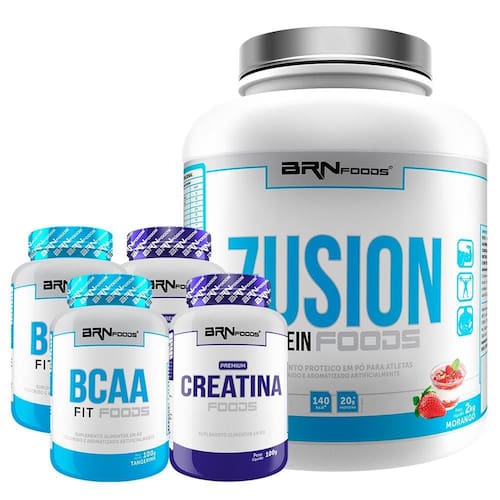 Kit fusion protein 2kg + 2x bcaa 100g + 2x creatina 100g - brnfoods sabor: morango. Kit brn foods whey protein fusion 2kg + 2x bcaa 100g + 2x creatina o que compõe o kit: 1x whey fusion: pote de 2kg 1x bcaa: pote de 100g whey protein fusion é composta por 7 proteínas combinadas, cada uma com diferentes perfis de aminoácidos. Sua fórmula garante absorção da proteína por um tempo prolongado e é a solução ideal para as necessidades de proteína de qualquer indivíduo. É uma boa opção para quem quer aumentar a quantidade de proteínas na dieta. Bcaa fit foods é indicado para ser ingerido antes e após o treino, pois fornece energia e retarda a fadiga central. Estimula a síntese de proteína muscular recuperando imediatamente os músculos danificados e prevenindo dores. A suplementação com bcaa está entre as mais importantes para qualquer programa nutricional esportivo, pois eles são indispensáveis para a manutenção e crescimento dos músculos. Sugestão de consumo: a fusion whey: adicionar 40g 4 colheres de sopa rasas em 300ml 1 1/2 copo de água gelada. Bater em liquidificador ou coqueteleira e consumir imediatamente após o preparo. B