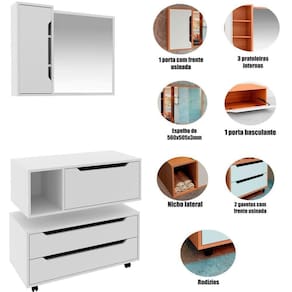 - Profundidade: Gabinete: 38,7 cm/Espelheira: 15,6 cm/Balcão: 38,7 cm