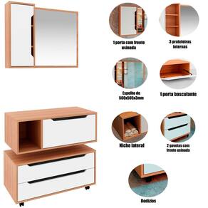 • 1 x Gabinete de Banheiro 80 cm com 1 Porta e Nicho 1 x Espelheira para Banheiro 80 cm com 1 Porta 1 x Balcão para Gabinete de Banheiro com 2 Gavetas e Rodízios Manual de Montagem Acessórios de Montagem