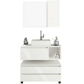 • 1 x Gabinete de Banheiro 80 cm com 1 Porta e Nicho 1 x Espelheira para Banheiro 80 cm com 1 Porta 1 x Balcão para Gabinete de Banheiro com 2 Gavetas e Rodízios 1 x Cuba para Gabinete de Banheiro Manual de Montagem Acessórios de Montagem