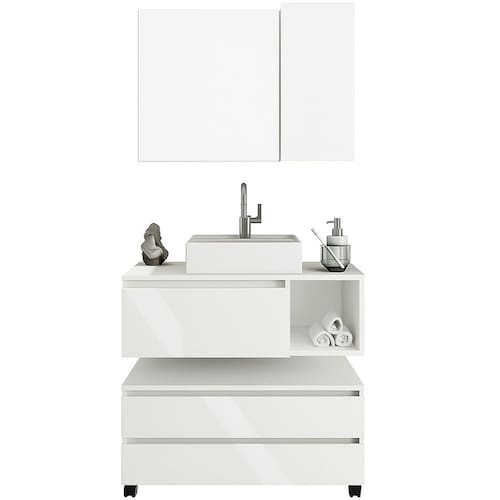 • Material: Gabinete/Balcão e Espelheira: Estrutura em MDP / Cuba: Mármore sintético