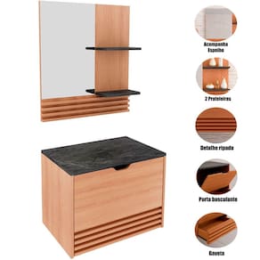 O Kit Gabinete e Espelheira de Banheiro 60 cm Sâmia é a escolha ideal para quem deseja unir estilo e praticidade no ambiente. Com estrutura em mdp de alta qualidade, o gabinete possui acabamento em BP e detalhes em pintura UV, o que garante maior durabilidade e resistência à umidade. Seu design com ripado frontal traz um toque contemporâneo que valoriza qualquer decoração de banheiro.