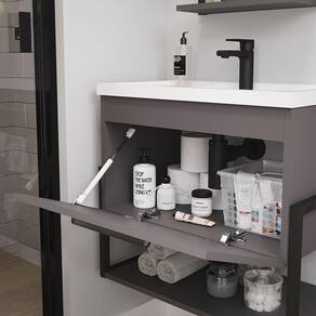 Características: Estrutura em MDF Acabamento em Pintura UV Puxador em alumínio preto fosco 01 Porta basculante com pistão à gás e dobradiças metálicas Suportes laterais em Metalon 20x20 com acabamento em pintura eletrostática preto fosco Acompanha cuba em mármore sintético