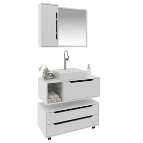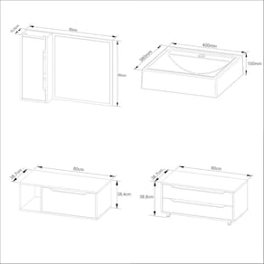O Kit para Banheiro é a escolha ideal para dar um toque de elegância e organização ao seu espaço. Com um design contemporâneo, ele transforma o ambiente em um local mais convidativo e prático. Fabricado com materiais de alta qualidade, o kit oferece durabilidade e um visual sofisticado, tornando seu banheiro ainda mais funcional e bonito. CARACTERÍSTICAS TÉCNICAS: - Produzida em MDP de 15 mm - Acabamento UV na cor Branco - Possui Espelho - Cuba em Mármore Sintético - Gaveteiro com Corrediças Metálicas e Rodízios - Porta Basculante com Articulador e Dobradiças Metálicas - Puxador tipo Cava - Balcão Suspenso *Kit Composto por Gabinete Suspenso (3644), Gaveteiro (3643), Espelheira (3645) e Cuba (3630) INFORMAÇÕES TÉCNICAS: 3643: Alt. 38,8 cm x Larg. 80 cm x Prof. 38,7 Cm x P. 15,4 kg 3644: Alt. 38,8 cm x Larg. 80 cm x Prof. 38,7 cm x P. 11,2 kg 3645: Alt. 60cm x Larg. 80 cm x Prof. 15,6 cm x P.11,35 kg 3600: Altura: 10 cm x Larg. 40 cm x Prof. 38 cm x P. 5 kg INFORMAÇÕES ADICIONAIS: - ATENÇÃO: Não trabalhamos e não nos responsabilizamos pela montagem do móvel. Antes da montagem conferir se o produto está de acordo com o que comprou, produto montado e danificado pela montagem não será aceito troca. Montagem e instalação por conta do comprador. - As imagens ambientadas são meramente ilustrativas e podem apresentar itens que não compõe o produto. As cores do produto podem variar de acordo com o monitor, a iluminação do ambiente ou sua percepção visual. - Limpeza: Deve ser feita com pano macio e seco ou levemente umedecido com água e sabão neutro. Não devem ser utilizados abrasivos como palha de aço e objetos cortantes. -Garantia para defeitos de fabricação conforme Código de Defesa do Consumidor.