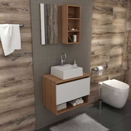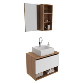 O Kit para Banheiro é a escolha ideal para transformar o seu espaço em um ambiente elegante e organizado. Com um design atual, ele oferece não apenas beleza, mas também funcionalidade, contribuindo para um banheiro agradável e útil. Produzido com materiais de alta qualidade, o kit garante durabilidade e resistência, criando um ambiente harmonioso e agradável para o seu dia a dia. CARACTERÍSTICAS TÉCNICAS: - Produzida em MDP de 15 mm - Acabamento UV na cor Amendôa e Branco - Acompanha Espelho - Cuba em Mármore Sintético - Balcão Suspenso - Porta Basculante com Dobradiça Metálica - Gaveta com Corrediça Metálica - Puxador tipo Cava - Possui 1 Prateleira *Kit Composto por Gabinete Suspenso (3606), Espelheira (3609) e Cuba (3630) INFORMAÇÕES TÉCNICAS: 3606: Alt. 46,5 cm x Larg. 60 cm x Prof. 38,7 cm x P. 12 kg 3609: Alt. 54 cm x Larg. 60 cm x Prof. 15,6 x P. 7,65 kg 3630: Alt. 11,5 x Larg. 35 x Prof. 34 cm P. 5,5 kg INFORMAÇÕES ADICIONAIS: - ATENÇÃO: Não trabalhamos e não nos responsabilizamos pela montagem do móvel. Antes da montagem conferir se o produto está de acordo com o que comprou, produto montado e danificado pela montagem não será aceito troca. Montagem e instalação por conta do comprador. - As imagens ambientadas são meramente ilustrativas e podem apresentar itens que não compõe o produto. As cores do produto podem variar de acordo com o monitor, a iluminação do ambiente ou sua percepção visual. - Limpeza: Deve ser feita com pano macio e seco ou levemente. Não devem ser utilizados abrasivos como palha de aço e objetos cortantes. Garantia para defeitos de fabricação conforme Código de Defesa do Consumidor.