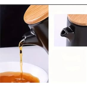 Conjunto para armazenamento de condimentos composto por dois recipientes em cerâmica na cor preta e acessórios em bambu. O item inclui um galheteiro com bico dosador e tampa, um pote circular com tampa vazada para colher, uma colher de cerâmica e uma bandeja de suporte em bambu com encaixes circulares. Indicado para armazenamento de azeite, vinagre, sal, açúcar ou farinhas. A cerâmica possui acabamento liso e as tampas vedação simples por sobreposição.