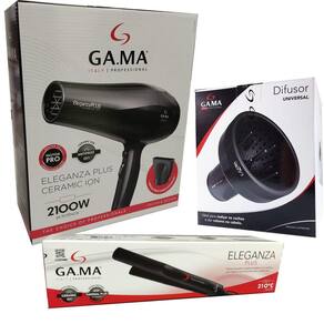SECADOR DE CABELO GAMA ELEGANZA PLUS CERAMIC ION 2100W - 127VCom 2.100W de potência, motor profissional e alta emissão de íons negativos, o secador Eleganza Plus Ceramic Ion é para quem busca praticidade no dia à dia e custo benefício!Devido a alta emissão de íons, ele produz um efeito antifrizz e mantém a umidade natural ao mesmo tempo que fecha a cutícula capilar, resultando em cabelos mais saudáveis, sedosos e com menos frizz.Possui um fluxo de ar impressionante, 2 velocidades, 3 níveis de temperatura e botão de jato de ar frio.Bico Direcionador De Ar2 Velocidades3 TemperaturasJato De Ar Frio - Cabelos Com Mais Brilho E Menos FrizzAntifrizz - Seu Cabelo Com Muito Mais Brilho, Maciez E Com Menos Frizz. CHAPINHA PRANCHA ALISADORA GAMA ELEGANZA PLUS 210ºC - BIVOLTCom potente resistência de cerâmica, a prancha Eleganza Plus oferece emissão de íons, que selam as cutículas do cabelo, mantendo a umidade natural dos fios, deixando-os muito mais brilhantes e sedosos, longe do temido efeito frizz. Além do mais, seu design arrojado facilita a modelagem de cachos e ondas, além do liso perfeito.Modelo: Eleganza PlusCor: PretoPotência: 34 - 37WConsumo: 0,04 kw/hTemperatura: Até 210 °CCabo: 1,8 metrosVoltagem: Bivolt AutomáticoCabo: FlexívelPeso: 0,241 kgDimensões (L x A x C): 2,5 x 4 x 24,5 cmDIFUSOR DE AR UNIVERSAL GAMA O Difusor Universal é compatível com todos os tipos de secadores. Tem como função garantir fios com volume e forma na hora da secagem. É revestido com a tecnologia Thermal Plus, ou seja, o calor não é transferido para toda sua extensão. A peça permite, ainda, distribuição homogênea do ar, para uma secagem perfeita.Dimensões do produto - 15 x 17,5 x 15Cor - PretoPeso do produto (kg) - 0,315
