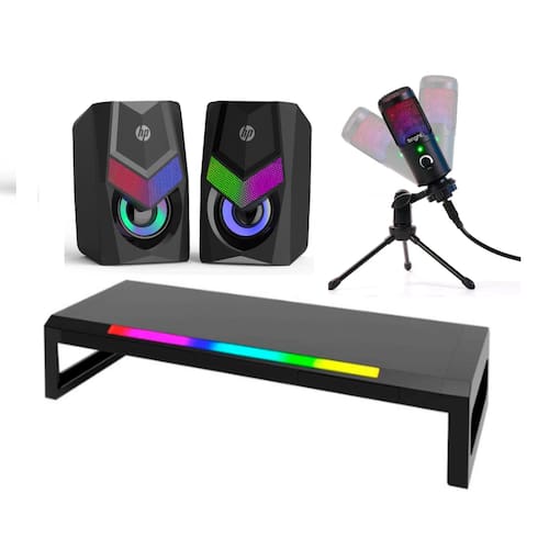 Kit Gamer Suporte Iluminado para Monitor, Microfone Streamer de Mesa E Cxa Som Estéreo Dhe-6000 Rgb, 6w
