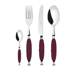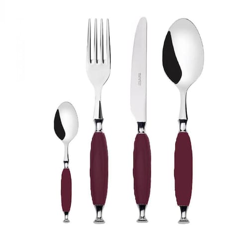 O jogo de garfo, faca, colher de sopa e colher de café da Linha Country da Bugatti apresenta cabo em acrílico com efeito madrepérola suavemente arredondado e aro cônico em aço polido.