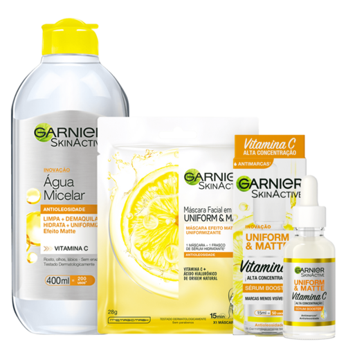 Kit Garnier SkinActive Trio com água micelar, sérum facial e máscara em tecido para uma pele mais uniforme. Indicado para peles oleosos.