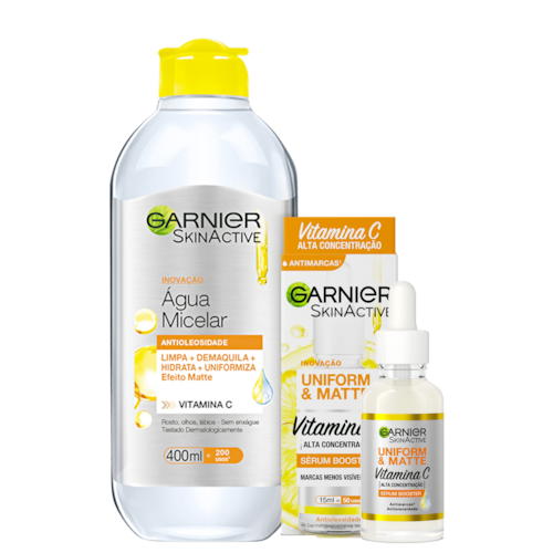 O Kit Garnier SkinActive Uniform & Matte possui produtos com Vitamina C, o que permite uma poderosa ação oxidante, reduzindo o aparecimento de manchas. Além disso, tonifica o rosto e confere efeito matte.