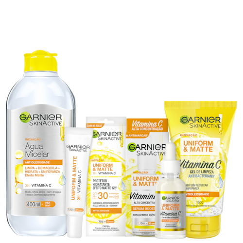 O Kit Garnier Skin Active Uniform & Matte Quarteto protege a pele da ação dos raios solares e também estimula a produção de colágeno. Além disso, confere efeito matte, possui ação antioxidante e antibacteriana.