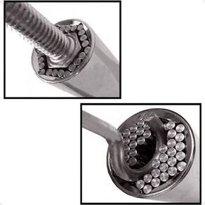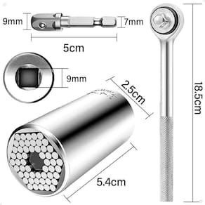 Material: Ferro, Aço, Carbono Cor: prata Encaixe: Em tamanhos padrão de 1/4" a 3/4" e métricos de 7 a 19mm Profundidade máxima: 3/8" Diâmetro externo de 1" Torque: Aproximadamente 125 Libras (Aproximadamente 169,5 N.m) Soquete: 54 Pinos Compatibilidade: Serve para parafusos do tipo borboleta, sextavado, quadrado, gancho, olho, cap, etc.