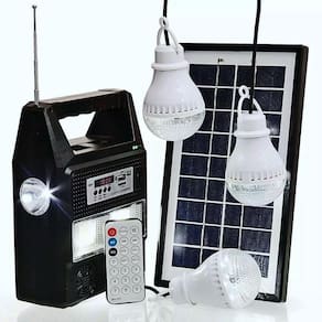 Kit Gerador Energia Solar Rádio Bluetooth Placa Solar 3LampKit gerador de energia solar rádio fm usb bluetooth, bateria 3 lampadas led com lanterna e led placa solar powerbank pescaria camping acampamento maquetesPra você que busca um produto versátil que pode ser usado de várias formas e em qualquer lugar, este kit de energia solar com rádio fm usb bluetooth é o item que você precisa.Nesse kit você encontra várias funções, como por exemplo, pode usá-lo com o rádio fm usb bluetooth, lanterna, luz de emergência e se precisar pode ser usado como powerbank isso mesmo,Ele vem com uma bateria recarregável que pode carregar seu celular quando precisar.Por ser portátil, te permite usar onde você precisar, pois vem com 3 lâmpadas bulbo led de 3w de alta intensidade, seja em casa, no campo, pescaria ou até no acampamentoEsse kit te atenderá com certeza.Você tem a opção de carregar a bateria dele através da energia elétrica, ou se precisar ele vem com sua própria placa de energia solar, para que você não fique nunca sem energia e onde quer que esteja.Diferenciais:. Rádio fm usb bluetooth controle remoto. Com porta usb carrega celular, tablet, lanterna, luminária etc. Aplicações: celular, tablet, lanterna, luminária, emergência. Ideal para viagens camping, acampamento, estudo em escolas, feira de ciência, maquetes, demonstrativo da energia solar, luminária de jardim, etc. Acende até 4 lâmpadas de led, porém o kit acompanha apenas 3 lâmpadas.. Gera energia sem sol sim, até em ambientes fechados com lâmpada mas pouca energia. Pode ficar exposto ao tempoEspecificações técnicas:. Entrada pen drive usb. Possui mp3. Possui radio fm. Tomada usb powerbank. Funciona como bateria externa para celular, tablets.. Possui modo lanterna e modo lampião.. Acompanha 3 lâmpadas bulbo de 3w. Tempo de trabalho de 4 á 6 horas. Bateria recarregável 4500mah 6v3ah. Fluxo luminoso lanterna 90lumêns. 3 lâmpadas bulbo led 6v/3w - 90 lumêns. Luz branca frio 6500k. Tamanho cabo das lâmpadas 4 metros em média. Tempo de carregamento energia: 13h. Tempo de carregamento painel solar: 12h. Cabo da placa solar: 2,70m. Painel solar de 9v / 3.5w-7w (entrada máxima inferior a 7w). Luz de emergência lateral 150 lumêns. Energia ac 220-249v. 50/60hz. Dimensões aprox. Bateria: 28x22x11cm. Dimensões aprox. Painel solar: 27x15,5cx1,5cm. Peso: 900gItens incluso:. 01 c0ntrole remoto. 01 placa geradora energia solar. 01 fonte carregadora ac/dc. 01 bateria / lanterna. 03 lâmpadas bulbo led 6v / 3w cada. 01 chicote com vários conectores para celularesImportante:. Garantia de 90 dias contra defeito de fabricação;Atenção:. Todos os produtos são testados antes do envio, evitando assim o envio de produtos com qualquer defeito de fabricação.