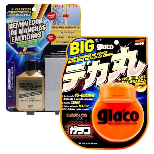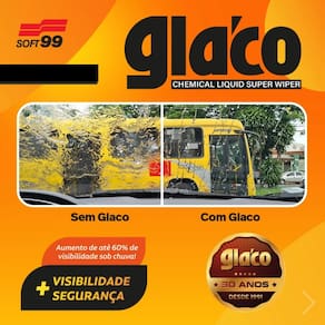GLACO BIG 120ML SOFT99 - REPELENTE DE ÁGUA Visibilidade e segurança é o que o Cristalizador de Vidros Glaco 75ml faz em seu veículo. É um super repelente de água que impede que gotículas de água permaneçam em seu para-brisa em dias chuvosos, facilitando a condução do carro em chuvas moderadas e tempestades. Em velocidades acima de 45km/h dependendo do volume de água, nem é necessário o uso do limpador de para-brisas pois o efeito que a repelência causa, faz com que as gotículas dispersem rapidamente dos vidros. CARACTERÍSTICAS: - De fácil aplicação, não requer qualquer habilidade específica, pois o feltro aplicador fixo no frasco do produto simplifica tal ação. - Glaco é um produto homologado no Japão pelos maiores fabricantes automotivos como Toyota, Honda, Nissan, Mazda, etc. - O Glaco 75ml forma uma película protetora em seu para-brisas fazendo com que as gotas de água fluam de maneira rápida evitando o acúmulo. - Diferente dos similiares não deixa seu para-brisas embaçado após a aplicação e nem mancha a pintura do veículo. - Rendimento: de 20 até 30 para-brisas - Cada aplicação dura até 2 meses. MODO DE USO: 1. Lave o(s) vidro(s) de seu carro e seque-o bem. 2. Agite o frasco, retire a tampa do Cristalizador de Vidros Glaco da Soft99 e pressione fortemente o feltro contra o vidro até que o líquido comece a sair. 3. Faça a aplicação em movimentos retos ou circulares em toda a extensão sem deixar falhas. 4. Aguarde de 10 a 15 minutos. O para-brisas ficará de aparência esbranquiçada. 5. Retire o excesso ultlizando uma toalha de algodão levemente úmida. 6. Para uma maior durabilidade evite utilizar o limpador por um intervalo de 3 horas. Obs: Utilizar somente do lado externo do para-brisas ------------------------------------------------------------------------------------------------------- •Glass Refresh Soft99 é um descontaminante de vidros poderoso.•Remove oleosidades.•sujeira impregnada•cristalizadores de para-brisa•Também é um super removedor de manchas de vidros, conhecidas como "water spot" ou chuva ácida.•Remove também manchas causadas por deposito de cloro ou íons. Produto 100% seguro, pois é a base d’água.recomendado para todos os vidros externos do veículo, retrovisores e teto solar. Acompanha uma esponja especial de fibra de ROF próprio para sua aplicação. Glass Refresh revitaliza os vidros devolvendo a aparência e brilho. Indicado para ser utilizado antes do procedimento de cristalização dos vidros, principalmente linha Glaco.Modo de Usar:• Lave Bem o Vidro, Removendo Toda Areia e Poeira• Seque Bem com Uma Toalha Limpa e Adequada• Aplique Cerca de 3 Gotas do Composto no Lado Branco da Esponja• Esfregue o Vidro Colocando Pressão, Certificando-se Que o Composto está Agindo em Cima da Superfície• Após Esfregar Bem, ao Final Lave o Vidro com Água Corrente• Em Casos de Manchas Severas ou Persistentes, Repita Operação até Atingir o ObjetivoAtenção: É recomendado que pessoas alérgicas utilizem luvas para manusear este produto. Mantenha longe das crianças e animais domésticos. CONTÉM 1 X CRISTALIZADOR DE VIDROS GLACO BIG 120ml SOFT99 1 X GLASS REFRESH 80ml SOFT99 REMOVEDOR DE CHUVA ACIDA 1 X APLICADOR GLASS