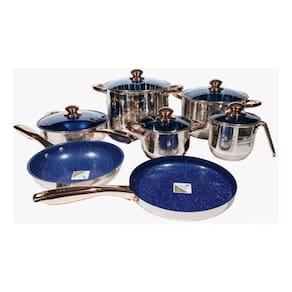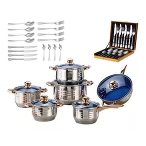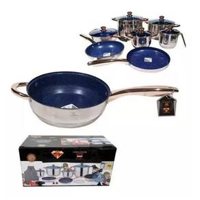 Kit gourmet completo jogo de panelas 23 peças + talher faqueiro 16 peças Jogo de panelas alemã - aço cirúrgico 23 peças - luxo azul - panelas de ótima qualidade - peças em aço cirúrgico com revestimento antiaderente. - Utilizado pelos melhores chefes de cozinha do mundo. - super luxuosa. - cabo rose gold - revestimento pfluon em cor azul. Características: - 23 peças - 9 camadas de cerâmica em aço cirúrgico 18/10 gramatura termostato - 2 frigideiras - 4 panelas - 1 fritadeira - 5 tampas - 6 colheres - 1 grade de fritadeira - 1 avental - 2 dois puxador - 1 porta panela 23 peças tampas são contadas como peças Aço inóx 18/10 e vidro temperado nas tampas Tampas com termostato externo para melhor controle do seu prato. Jogo de panelas 12 peças 01 - 1 panela 6.5 litros medindo 24cmx14cm com tampa de vidro 02 - 1 panela 3.0 litros medindo 20cmx10cm com tampa de vidro 03 - 1 panela 1.6 litros medindo 16cmx08cm com tampa de vidro 04 - 1 frigideira 3.0 litros medindo 24cmx6.5cm com tampa de vidro 05 - 1 panela 1.6 litros medindo 16cmx09cm com tampa de vidro 06 - 1 panela vaporizadora medindo 20cmx10cm sem tampa 07 - 1 cesta inox fritadeira medindo 18cm Jogo de talheres: Kit faqueiro maleta de talheres inox 16 peças Linda maleta com dimensões de 34,5cm x 26cm. Contém: 4 facas; 4 garfos; 4 colheres; 4 colheres pequenas. Marca: Não Informado