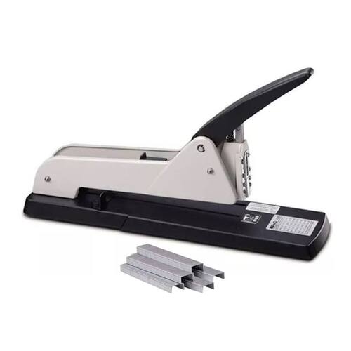 O grampeador profissional metal longo alcance 250 mm para até 200 folhas é uma ferramenta robusta e pensada para quem precisa unir grandes volumes de papel com rapidez e segurança. Feito em metal resistente, ele oferece maior durabilidade e firmeza do que os grampeadores comuns, suportando uso intenso em ambientes como escritórios, gráficas, repartições públicas, escolas e papelarias. O longo alcance de 250 mm permite grampear documentos bem no centro ou em áreas mais profundas da folha, o que é ideal para relatórios espessos, pastas, fichários e materiais encadernados, garantindo que tudo fique bem preso e profissionalmente apresentado. Por ser projetado para até 200 folhas por vez, ele reduz o tempo gasto organizando pilhas de papel, evitando múltiplas grampeações e mantendo os documentos alinhados e seguros. Além disso, a construção metálica confere estabilidade ao equipamento, diminuindo a chance de travamentos ou falhas durante o uso. O design geralmente inclui alavanca ergonômica que facilita a aplicação da força, tornando o grampeamento menos cansativo mesmo em tarefas maiores. É a escolha certa para quem busca eficiência, confiabilidade e precisão na organização de papéis volumosos no dia a dia. Grampeador de longo alcance, modelo 5000. Este grampeador profissional possui corpo e estrutura em metal, proporcionando a força necessária para grampear até 200 folhas de maneira ágil e prática. Possui ajuste de profundidade de até 25 cm e capacidade para armazenar até 200 grampos.