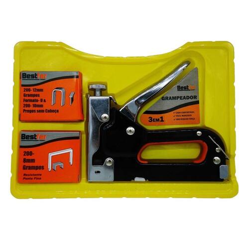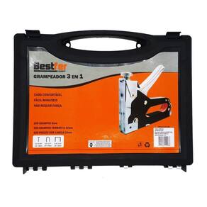 Grampeador e Pinador Manual Aplica grampos comuns, grampos formato U e Pinos (pregos sem cabeça) Para uso em Artesanato, Tapeçaria, Pequeno Reparos e Telas de Pintura Tamanho aprox.: 14cm x 16cm x 2,5cm Utiliza: Grampos de 4mm até 14mm, Grampos formato U de 10mm até 12mm e Pinos (pregos sem cabeça) de 10mm até 14mm Acompanha: Grampos, pinos e Maleta para transporte.