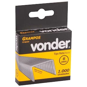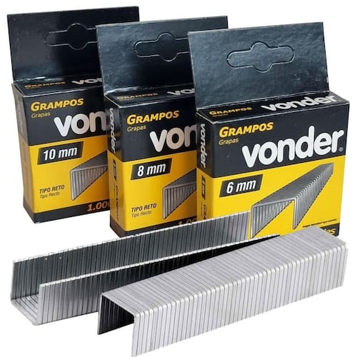 - Marca: Vonder - Referência: 2898406012 - 1.000 Grampos de 6mm de Altura - 1.000 Grampos de 8mm de Altura - 1.000 Grampos de 10mm de Altura - Largura do grampo: 11,4 mm - Medidas do arame: 1,2 mm - Caixa com 1.000 grampos - Material do grampo: aço carbono - Tipo do grampo: reto - Possui acabamento zincado, proporcionando maior resistência à oxidação/corrosão - Garantia: 90 dias
