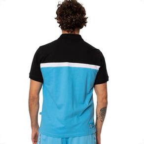 Detalhes do Produto: Material: Meia malha 100% algodão, proporcionando leveza e respirabilidade Cor: Corpo em azul celeste com mangas, gola e recorte lateral em preto Decote: "V" com gola em preto, oferecendo um ajuste elegante e casual