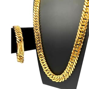 Kit Grumet 13mm Corrente + Pulseira Banhado a Ouro 18K Detalhes do Produto: Material: ligas metálicas de alta qualidade, especialmente tratadas para fixação e absorção do ouro, com acabamento em verniz protetor. Aparência: visual idêntico ao ouro maciço. Produção: artesanal, com atenção meticulosa aos detalhes. Banho: 10 camadas espessas de ouro 18k, finalizadas com verniz antialérgico . Elos: soldados varia conforme o modelo . Pedras: zircônias brilhantes cravejadas quando aplicável . Tamanhos Disponíveis: Cordões Masculinos: 70cm padrão e 60cm sob consulta/Pedido Via Chat . Cordões Femininos: 50cm padrão e 45cm sob consulta/Pedido Via Chat . Pulseiras: 21cm padrão ; tamanhos de 18cm a 23cm sob consulta/Pedido Via Chat. Pingentes: conforme imagens; consulte para mais detalhes via chat. Espessuras Recomendadas para Cordões / Pingentes: P: 1mm a 4mm M: 4mm a 8mm G: 6mm a 13mm Gg: 12mm a 18mm Incluso na Compra: Saquinho de organza para armazenamento seguro. Caixa elegante, perfeita para presente. Cupom de desconto para a próxima compra. Flyer com outros produtos da coleção. Carta de agradecimento personalizada. Adesivo da marca ToJoia18k. Informações Adicionais: : 6 meses termos acompanham o produto . Devolução: 7 dias para devolução sem questionamentos. Envio: despacho em até 24 horas úteis após confirmação do pagamento. Cuidados com a Peça: Evite contato com produtos químicos; aguarde o perfume secar antes de usar. Evite contato com shampoo, condicionadores e suor excessivo. Armazene em local seco, preferencialmente no saquinho de organza fornecido. Uso no mar e piscina é permitido; lave com água corrente e sabão neutro após. Por que Escolher a ToJoia18k Semi-joias luxuosas que combinam estilo, qualidade e sofisticação. Banho espesso de ouro 18k, garantindo brilho duradouro e acabamento impecável. Design exclusivo e produção artesanal, perfeitos para qualquer ocasião. Materiais premium que asseguram durabilidade. Ao escolher uma semi-joia ToJoia18k, você investe em qualidade, elegância e uma experiência única. Aguardamos sua compra Observação: pode ocorrer variação no fecho raramente . Imagens reais, sem edição. Qualquer dúvida, estamos à disposição para esclarecimentos.
