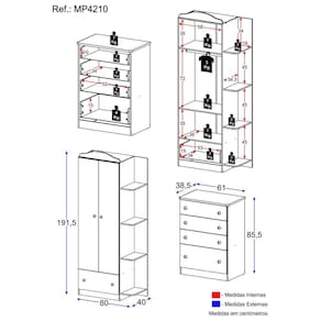 Dimensões do produto montado: Guarda-Roupas - Altura: 191,5cm | Largura: 80cm | Profundidade: 40cm Cômoda - Altura: 85,5cm | Largura: 61cm | Profundidade: 38,5cm *Você pode consultar as medidas detalhadas na imagem técnica do produto.