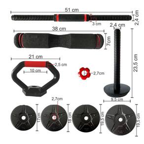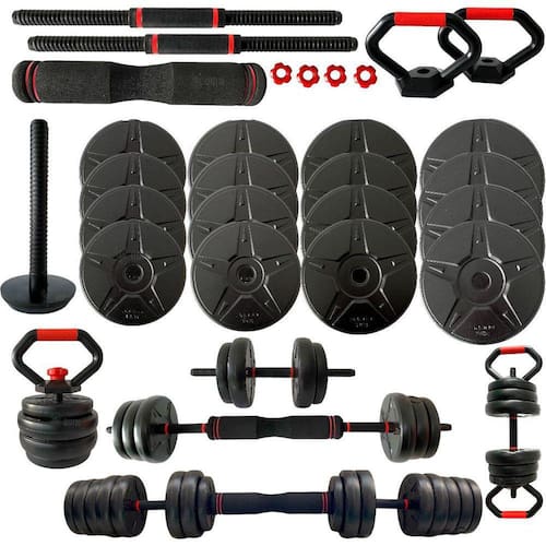 O kit multifuncional 6 em 1 Odin Fit é um kit versátil que te possibilita um treino completo com inúmeros exercícios. O kit te proporciona várias formas de montagens como: Kettlebell, Par de Halteres, Halter com pegada externa, Apoio fixo para flexão, barra 102cm e barra 120cm sendo todos estes com peso ajustável.Um único kit te permite ter os principais equipamentos para um treino de pernas, braços, costas, bíceps, tríceps e demais grupos musculares que podem ser trabalhados com um treino de pesos livres.A possibilidade de ajuste de carga te permitirá alterar os níveis de exercícios a serem realizados com esse kit. O kit acompanha 30kg em anilhas podendo ser montado da forma que desejar, com todas as anilhas, ou com a quantidade de peso que desejar, podendo também ser utilizado sem carga apenas o peso das barras . O kit multifuncional de barras e kettlebell Odin Fit possui 26 itens te permitindo uma infinidade de montagens para realizar o seu treino em casa ou onde quiser.Composição do kit:4 anilhas com revestimento em ABS de 1,25kg;4 anilhas com revestimento em ABS de 1,5kg;4 anilhas com revestimento em ABS de 2kg;4 anilhas com revestimento em ABS de 2,5kg;2 barras rosqueáveis 51cm;1 barra rosqueável revestida em EVA 38cm;1 base para montagem de kettlebell;2 puxadores para kettlebell que servem como apoio fixo para flexão ;4 presilhas de rosca para as barras;Especificações:Diâmetro da barra central revestida por EVA: 7cm;Comprimento da barra revestida por EVA: 38cm;Material da barra halter: Aço revestido em ABS de alta resistência;Comprimento da barra halter: 46cm;Diâmetro da barra halter: 2,4cm na área de suporte das anilhas e 3cm no centro pegada ;Diâmetro da circunferência interna das anilhas: 2,7cm;Composição das anilhas: Pó de ferro + cimento, revestido em ABS de alta resistênciaRevestimento das anilhas: ABS de alta resistência;Material das presilhas rosqueáveis: ABS;Altura da base para montagem do Kettlebell: 13,7cm;Diâmetro do apoio da base para montagem de kettlebell: 9,9cm;Diâmetro da pegada do puxador do kettlebell/apoio fixo: 2,5cm;Peso ajustável Sim;Possibilidades de montagem: Kettlebell, Par de Halteres, Halter com pegada externa, Apoio fixo para flexão, barra 102cm e barra 120cm variável conforme montagem .Peso máximo na montagem do kettlebell: 10kg;Peso mínimo na montagem do kettlebell: 530g sem anilhas, só a base + puxador ;Peso máximo possível na montagem de 1 halter: 18 kg;Peso mínimo na montagem de 1 halter: 365g só a barra sem anilhas ;Peso máximo na montagem da barra completa: 30kg;Peso mínimo na montagem da barra 120cm: 1,200 kg só a barra sem anilhas ;Peso de suporte máximo recomendado: 30kgNão é recomendado utilizar anilhas extras que não acompanhem o kit.Obs: Produto não acompanha maleta.Alguns exemplos de exercícios que podem ser realizados com o kit musculação multifuncional Odin Fit:Kettlebell: stiff, agachamentos, afundos, remada curvada, desenvolvimento, abdominal twist, swings, get ups, remadas, halo, pullover, entre outros.Par de halteres: supino, elevações, extensão de tríceps, trações, flexões de braço, remada, rosca direta/martelo, desenvolvimento, avanço, stiff, crucifixo, entre outros.Halter com pegada externa: remada aberta curvada, rosca martelo, pullover, entre outros.Apoio Fixo para Flexão: Flexão de braços, prancha alta pegada neutra;Barra reta 102cm: Levantamento terra, agachamento, avanço, supino, rosca direta, desenvolvimento, pullover, elevações, remadas, entre outros.Barra reta 120cm variável conforme montagem : Levantamento terra, agachamento, avanço, supino, rosca direta, desenvolvimento, pullover, elevações, remadas, entre outros.Garantia de 3 meses contra defeitos de fabricação.