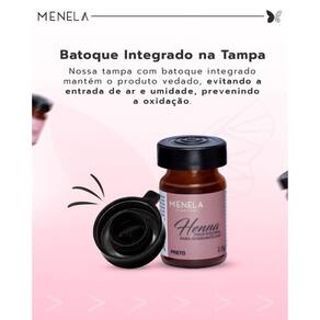 Henna para Sobrancelhas Menela A Henna Menela é a número 1 entre as designers de sobrancelhas por uma razão: resultado impecável com tecnologia de ponta. Desenvolvida com nanotecnologia, ela pigmenta as camadas mais profundas da pele e dos pelos - até mesmo os brancos - com fixação e intensidade, garantindo um design marcante e duradouro. É referência em performance, rendimento e segurança para quem exige o melhor. Benefícios e características da Henna Menela: Alta pigmentação desde o primeiro minuto Cobre até pelos brancos com intensidade Rendimento superior: até 60 aplicações por pote Duração de até 15 dias na pele Brilho natural e realce do desenho Aplicação rápida: de 1 a 20 minutos Praticidade com batoque integrado Fácil preparo e Dermatologicamente testada e aprovada pela ANVISA Não contém Cinza, amônia, parabenos, peróxido de hidrogênio, iodo nem metais pesados Produto Cruelty Free O que vem no Kit Henna Menela: 1 Henna Menela 2,5g com batoque integrado 1 Fixador com Extrato de Bambu 15ml 1 Pá dosadora/medidora Modo de Preparo e Aplicação: Higienize as sobrancelhas, removendo oleosidade e impurezas. Agite bem o fixador antes de usar. Misture 1 pá de henna com 15 a 25 gotas do fixador até obter a consistência ideal uso de mixer é recomendado . Aplique com pincel apropriado e deixe agir de 1 a 20 minutos. Remova com algodão umedecido em água mineral. Marca: Não Informado