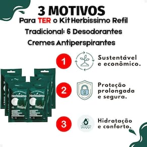 Garanta proteção eficaz e duradoura contra o suor e o mau odor com o Desodorante Em Creme Refil Herbíssimo Tradicional Antiperspirante 45g. Desenvolvido pela tradicional marca HERBISSIMO, este refil é a escolha inteligente para quem busca economia sem abrir mão da qualidade e do cuidado com o meio ambiente. Sinta a confiança de estar protegido o dia todo, com uma fórmula suave que hidrata a pele e evita irritações. Ideal para homens e mulheres que prezam por praticidade e bem-estar, este refil é perfeito para manter a sua rotina de higiene pessoal em dia, com a vantagem de um produto sustentável e econômico.