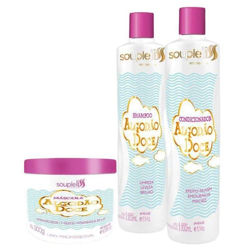 Souple liss kit algodão doce 3 produtos pequenos A linha algodão doce da souple liss professional proporciona aos fios uma restauração completa dos fios, devolvendo brilho, maciez e nutrição sem pesar os fios, promovendo o efeito núvem leveza e sedosidade. Sua fórmula contem 7 óleos essenciais, aminoácidos além das vitaminas a, b5 e d que promovem uma reconstrução completa, devolvendo todos nutrientes perdidos durante procedimentos químicos ou pelo desgaste mecanico causados por chapinhas, secadores e escovas. Conselho de aplicação: Lavar os cabelos com o shampoo algodão doce massageando o couro cabeludo suavemente com as pontas dos dedos, enxaguar. Em seguida, com os cabelos úmidos, aplicar a mascara algodão doce e deixar agir por 10 minutos e enxaguar bem. Aplicar o condicionador nos cabelos já nutridos com máscara, do comprimento até as pontas, massageando os fios com suavidade para o perfeito selamento das cutículas. Após isso enxaguar e finalizar como preferir. Resultado: Cabelos com brilho, leveza, maciez e com aspecto e efeito nuvem. Contém: 01- souple liss algodão doce - shampoo 300ml 01- souple liss algodão doce - condicionador 300ml 01- souple liss algodão doce - máscara 300g Ean: 7898955990810