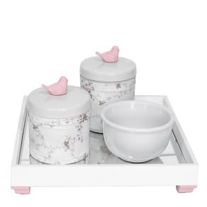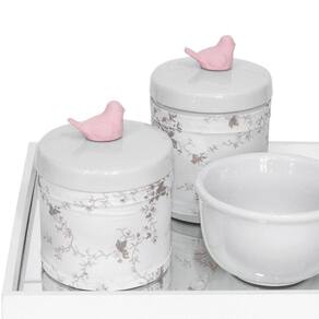 Aposte nesse kit higiene que foi desenvolvido para facilitar a vida das mamães e papais na hora de higienizar o bebê Produzido com materiais de alta qualidade, o kit conta com bandeja espelhada e porcelana de qualidade. Além disso, é um lindo item decorativo que irá encantar a todos Dados TécnicosKit higiene com bandeja em MDF com pintura branca com detalhe rosa, fundo de espelho e decoração com resinas de Passarinho rosa nas tampas dos potes com capas Itens Inclusos no Kit01 Bandeja com espelho01 Pote grande em porcelana branca com tampa01 Pote pequeno em porcelana branca com tampa01 Molhadeira em porcelana branca01 Conjunto de 2 capas em tecido e tiras aderentes para pote grande e pote pequeno MedidasBandeja: 25 cm de largura, 25 cm de comprimento e 4,5 cm de alturaPote Grande: 9 cm de diâmetro e 10 cm alturaPote Pequeno: 9 cm de diâmetro e 8,5 cm alturaMolhadeira: 10,5 cm de diâmetro e 6,5 cm de altura