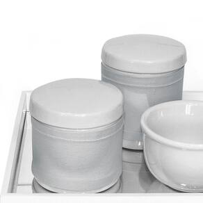 Aposte nesse kit higiene que foi desenvolvido para facilitar a vida das mamães e papais na hora de higienizar o bebê Produzido com materiais de alta qualidade, o kit conta com bandeja espelhada e porcelana de qualidade. Além disso, é um lindo item decorativo que irá encantar a todos Dados TécnicosKit higiene com bandeja em MDF com pintura branca com detalhe prata e fundo de espelho Itens Inclusos no Kit01 Bandeja com espelho01 Pote grande em porcelana branca com tampa01 Pote pequeno em porcelana branca com tampa01 Molhadeira em porcelana branca01 Conjunto de 2 capas em tecido e tiras aderentes para pote grande e pote pequeno MedidasBandeja: 25 cm de largura, 25 cm de comprimento e 4,5 cm de alturaPote Grande: 9 cm de diâmetro e 10 cm alturaPote Pequeno: 9 cm de diâmetro e 8,5 cm alturaMolhadeira: 10,5 cm de diâmetro e 6,5 cm de altura