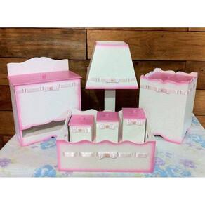 O kit é composto por 7 peças: Cesta, 3 Potes (P, M e G), Abajur, Porta Fraldas e Lixeira.