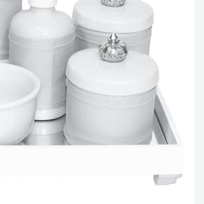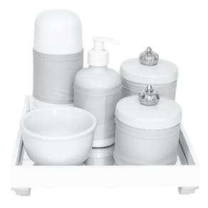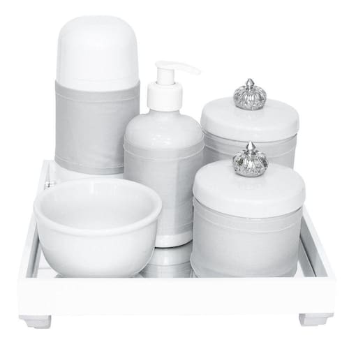 Aposte nesse kit higiene que foi desenvolvido para facilitar a vida das mamães e papais na hora de higienizar o bebê Produzido com materiais de alta qualidade, o kit conta com bandeja espelhada e porcelana de qualidade. Além disso, é um lindo item decorativo que irá encantar a todos Dados TécnicosKit higiene com bandeja de MDF em pintura branca com detalhe prata, fundo de espelho e decoração com resinas de Coroa prata nas tampas dos potes com capas Itens Inclusos no Kit01 Bandeja com espelho01 Garrafa Térmica - Marca Termolar - 250 ml01 Pote grande em porcelana branca com tampa01 Pote pequeno em porcelana branca com tampa01 Molhadeira em porcelana branca01 Porta Álcool-Gel/ Sabonete Líquido em porcelana branca01 Conjunto de 4 capas em tecido e tiras aderentes para garrafa térmica, pote grande, pote pequeno e porta álcool-gel MedidasBandeja: 25 cm de largura, 25 cm de comprimento e 4,5 cm de alturaGarrafa Térmica: 7,5 cm de diâmetro e 18 cm de alturaPote Grande: 9 cm de diâmetro e 10 cm alturaPote Pequeno: 9 cm de diâmetro e 8,5 cm alturaMolhadeira: 10,5 cm de diâmetro e 6,5 cm de alturaPorta Álcool-Gel/Sabonete Liquido: 6,5 cm de diâmetro e 15 cm de altura