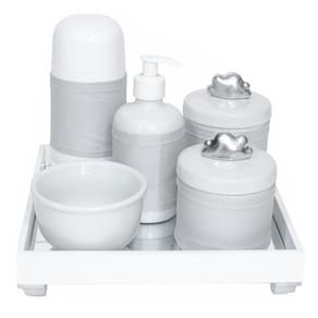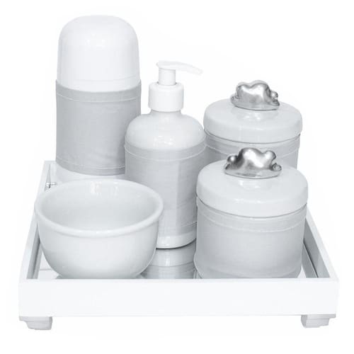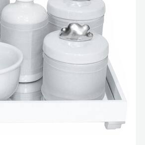 Aposte nesse kit higiene que foi desenvolvido para facilitar a vida das mamães e papais na hora de higienizar o bebê Produzido com materiais de alta qualidade, o kit conta com bandeja espelhada e porcelana de qualidade. Além disso, é um lindo item decorativo que irá encantar a todos Dados TécnicosKit higiene com bandeja de MDF em pintura branca com detalhe prata, fundo de espelho e decoração com resinas de Nuvem prata nas tampas dos potes com capas Itens Inclusos no Kit01 Bandeja com espelho01 Garrafa Térmica - Marca Termolar - 250 ml01 Pote grande em porcelana branca com tampa01 Pote pequeno em porcelana branca com tampa01 Molhadeira em porcelana branca01 Porta Álcool-Gel/ Sabonete Líquido em porcelana branca01 Conjunto de 4 capas em tecido e tiras aderentes para garrafa térmica, pote grande, pote pequeno e porta álcool-gel MedidasBandeja: 25 cm de largura, 25 cm de comprimento e 4,5 cm de alturaGarrafa Térmica: 7,5 cm de diâmetro e 18 cm de alturaPote Grande: 9 cm de diâmetro e 10 cm alturaPote Pequeno: 9 cm de diâmetro e 8,5 cm alturaMolhadeira: 10,5 cm de diâmetro e 6,5 cm de alturaPorta Álcool-Gel/Sabonete Liquido: 6,5 cm de diâmetro e 15 cm de altura