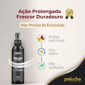sobre o spray O spray bucal de tutti-frutti da peluche cosméticos pet foi desenvolvido para eliminar o mau hálito dos pets, proporcionando beijos sem bafinhos. Sua fórmula especial não contém açúcar ou qualquer substância química prejudicial à saúde de seu pet Modo de usar: aplique diretamente na boca do pet, 5 vezes ao longo do dia.