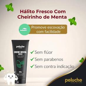 O creme dental da peluche cosméticos pet a base de menta foi desenvolvido para promover a higienização bucal do seu pet, evitando o mau hálito e prevenindo a formação de placas bacterianas, tártaros, gengivite, amarelamento, entre outras doenças bucais. Sua fórmula não contém flúor ou sabão que sejam nocivos aos pets, podendo assim ser ingerido sem perigo.
