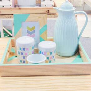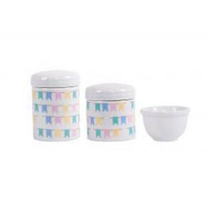 Kit Higiene cores pastéis Esse Kit Higiene cores pastéis se resume em charme e delicadeza. Feito em porcelana branca com detalhes de bandeirinhas nas cores pastéis, é ideal para auxiliar a mamãe na troca do bebê. O kit é composto por 3 peças, sendo um bowl, um pote maior e outro menor. Além de prático, proporciona sutileza e doçura no cantinho da higiene.