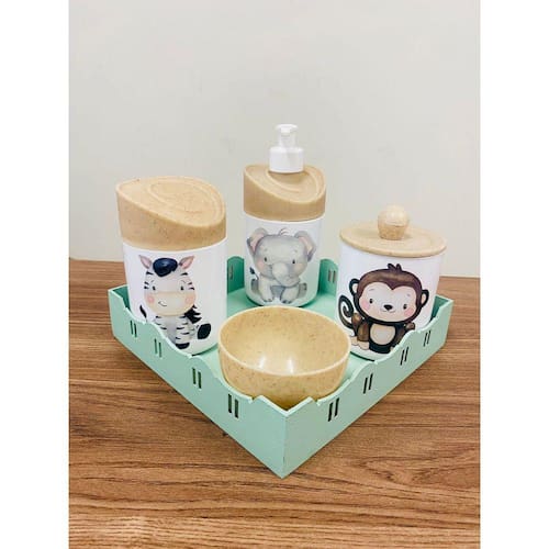Kit Organizador para bebê c/bandeja Cor dos Potes: BRANCO PADRÃO MATERIAL DOS POTES: ACRÍLICO MATERIAL DA BANDEJA: MDF Kit acompanha: - 1 bandeja de madeira em MDF - 1 porta sabonete / álcool gel - 1 molheira - 1 porta algodão - 1 porta cotonete MEDIDAS DA BANDEJA EM MDF: Diâmetro: 20x20cm MEDIDA DOS POTES: Porta algodão/cotonete: 8x10,5 cm Porta sabonete líquido: 12x21 cm Molheira: 8x5 cm Ean: 7898901200130