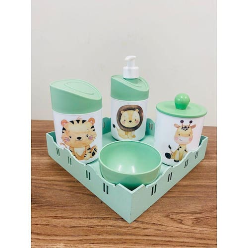 Kit Organizador para bebê c/bandeja Cor dos Potes: BRANCO PADRÃO MATERIAL DOS POTES: ACRÍLICO MATERIAL DA BANDEJA: MDF Kit acompanha: - 1 bandeja de madeira em MDF - 1 porta sabonete / álcool gel - 1 molheira - 1 porta algodão - 1 porta cotonete MEDIDAS DA BANDEJA EM MDF: Diâmetro: 20x20cm MEDIDA DOS POTES: Porta algodão/cotonete: 8x10,5 cm Porta sabonete líquido: 12x21 cm Molheira: 8x5 cm Ean: 7898901200147