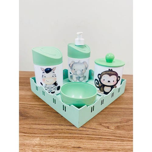 Kit Organizador para bebê c/bandeja Cor dos Potes: BRANCO PADRÃO MATERIAL DOS POTES: ACRÍLICO MATERIAL DA BANDEJA: MDF Kit acompanha: - 1 bandeja de madeira em MDF - 1 porta sabonete / álcool gel - 1 molheira - 1 porta algodão - 1 porta cotonete MEDIDAS DA BANDEJA EM MDF: Diâmetro: 20x20cm MEDIDA DOS POTES: Porta algodão/cotonete: 8x10,5 cm Porta sabonete líquido: 12x21 cm Molheira: 8x5 cm Ean: 7898901200123