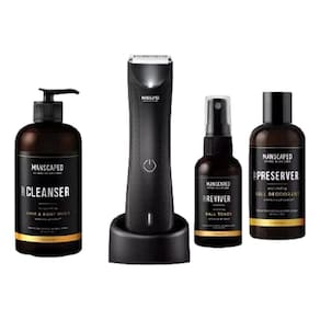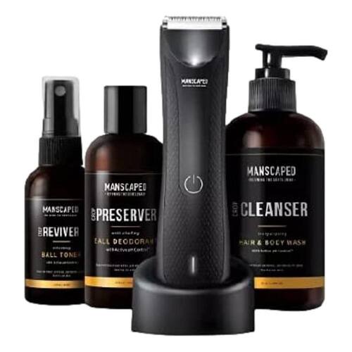 O kit contém: 1 aparador de pelos e virilha manscaped 3.0, 1 spray desodorante e hidratante virilha para homens de 60ml 1 desodorante hidratante higiene masculina de 100 ml 1 sabonete liquido para corpo e cabelo de 240 ml