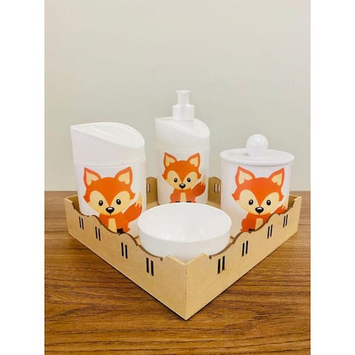 Kit Organizador para bebê c/bandeja Cor dos Potes: BRANCO PADRÃO MATERIAL DOS POTES: ACRÍLICO MATERIAL DA BANDEJA: MDF Kit acompanha: - 1 bandeja de madeira em MDF - 1 porta sabonete / álcool gel - 1 molheira - 1 porta algodão - 1 porta cotonete MEDIDAS DA BANDEJA EM MDF: Diâmetro: 20x20cm MEDIDA DOS POTES: Porta algodão/cotonete: 8x10,5 cm Porta sabonete líquido: 12x21 cm Molheira: 8x5 cm Ean: 7898901271864