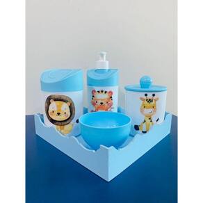 Kit higiêne de bebê Cor dos Potes: BRANCO Tampas: AZUL MATERIAL DA BANDEJA: MDF MATERIAL DOS POTES: ACRILICO Acomapanha: - 1 porta sabonete líquido/ porta álcool gel - 1 porta cotonete - 1 porta algodão - 1 molheira - 1 bandeja em MDF MEDIDAS DA BANDEJA EM MDF: Diâmetro: 19,5x19 cm Altura: 5x8cm MEDIDA DOS POTES: Porta algodão/cotonete: 8x10,5 cm Porta sabonete líquido: 12x21 cm Molheira: 8x5 cm Marca: Doya Kids