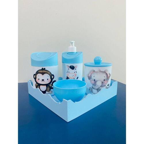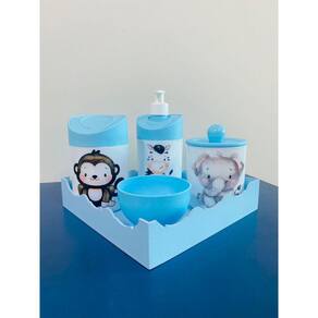 Kit higiêne de bebê Cor dos Potes: BRANCO Tampas: AZUL MATERIAL DA BANDEJA: MDF MATERIAL DOS POTES: ACRILICO Acomapanha: - 1 porta sabonete líquido/ porta álcool gel - 1 porta cotonete - 1 porta algodão - 1 molheira - 1 bandeja em MDF MEDIDAS DA BANDEJA EM MDF: Diâmetro: 19,5x19 cm Altura: 5x8cm MEDIDA DOS POTES: Porta algodão/cotonete: 8x10,5 cm Porta sabonete líquido: 12x21 cm Molheira: 8x5 cm Marca: Doya Kids
