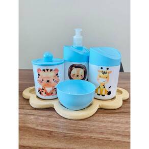 Kit Organizador para bebê c/bandeja em MDF. Cor do Pote: BRANCO PADRÃO Tampas: AZUL MATERIAL DOS POTES: ACRÍLICO MATERIAL DA BANDEJA: MDF Kit acompanha: - 1 bandeja de madeira em MDF. - 1 porta sabonete / álcool gel - 1 molheira - 1 porta algodão - 1 porta cotonete MEDIDAS DA BANDEJA EM MDF: Diâmetro: 19,5x19 cm Altura: 5x8cm MEDIDA DOS POTES: Porta algodão/cotonete: 8x10,5 cm Porta sabonete líquido: 12x21 cm Molheira: 8x5 cm Marca: Doya Kids Ean: 7898901271765